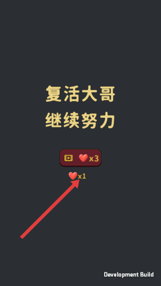 4、若角色失敗,會出現復活大哥繼續努力的界面,可選擇消耗愛心道具來復活角色,繼續游戲挑戰。