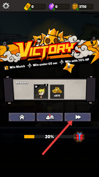 4、成功擊敗所有敵人后,會出現VICTORY勝利界面,展示獲勝相關信息和獎勵,可點擊箭頭按鈕繼續游戲。