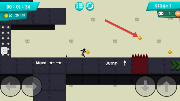 1、進入游戲,操控火柴人關卡場景移動,遇到金幣時,可通過移動讓火柴人收集金幣,同時注意躲避尖刺等障礙。