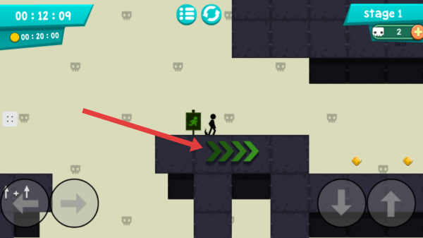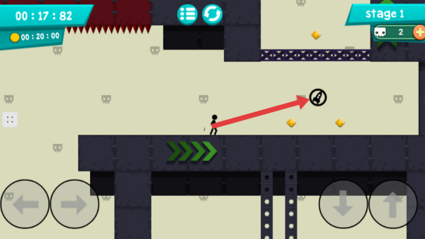 2、看到帶有綠色箭頭的區域,操控火柴人進入,能借助箭頭的助力,快速移動到下一個區域,推進游戲進程。