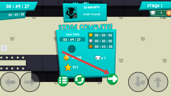 4、成功完成關卡后,會顯示STAGECOMPLETE界面,展示通關時間等信息,點擊綠色箭頭按鈕可進入下一關。