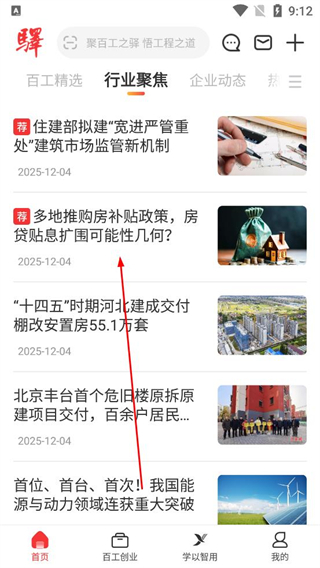 2、登錄成功后進入首頁,瀏覽行業聚焦板塊下的資訊列表,選擇多地推購房補貼政策相關條目,點擊進入該資訊的詳情頁面。