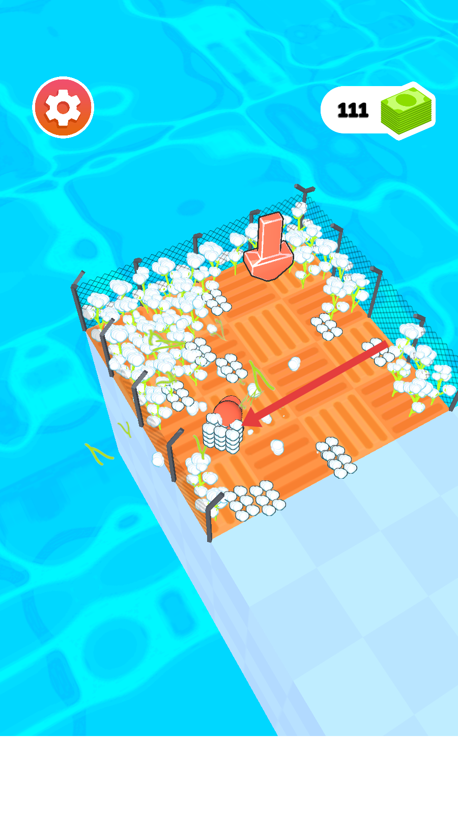 1、進入游戲場景,能看到水域旁的棉花種植區域,按照箭頭指引,收集白色的棉花,為后續加工做準備。