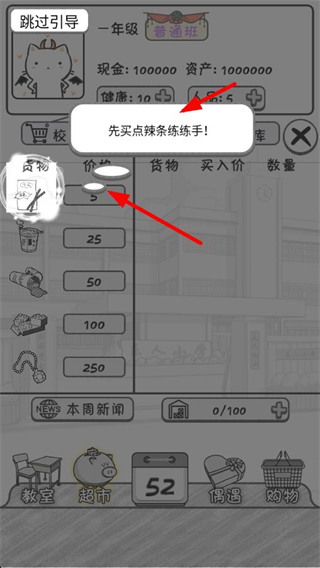 2、進入辣條的交易界面后,能看到購買所需花費,調整數量后點擊購買按鈕,就能完成辣條的買入操作,消耗對應現金獲得貨物。