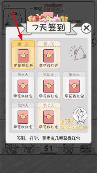 4、在7天簽到界面,第一天就能領取零花錢紅包,后續每天也能領取,簽到升學買賣都有幾率獲得紅包,助力資源積累。