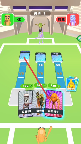 3、進入關卡對戰關卡1,選擇肌肉橙子等角色卡片,將其放置到對戰軌道上,與對手展開較量。