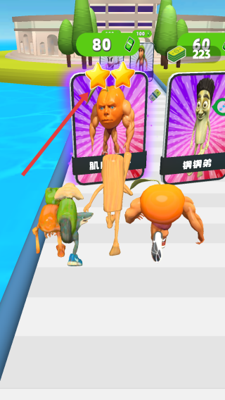 2、選擇肌肉橙子后,能看到卡片上方出現星級標識,同時有其他角色一同前行,強化隊伍力量。