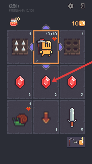 3、進入地牢關卡,方格布局的場景中,可選擇前往帶有紅色寶石的方格,獲取寶石資源,同時注意周圍的機關、怪物等元素。