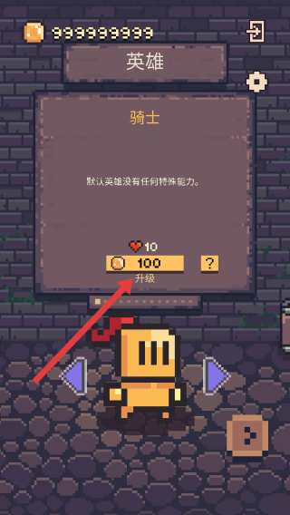 1、進入游戲,初始界面可看到英雄等按鈕,點擊相關按鈕能查看英雄信息,比如默認英雄騎士,無特殊能力,還有生命值和金幣等屬性。