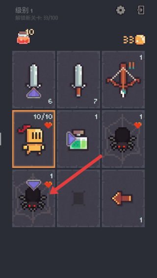 4、地牢中會遇到蜘蛛等怪物,操控角色與怪物戰斗,擊敗怪物可推進關卡進度,解鎖更多新關卡,繼續地牢冒險。