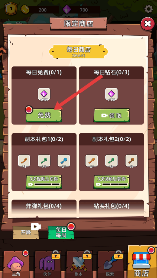 2、限定商店里,有每日免費、每日鉆石等不同類型的獎勵可領取,還有副本禮包、炸彈禮包等,能獲取各類道具。