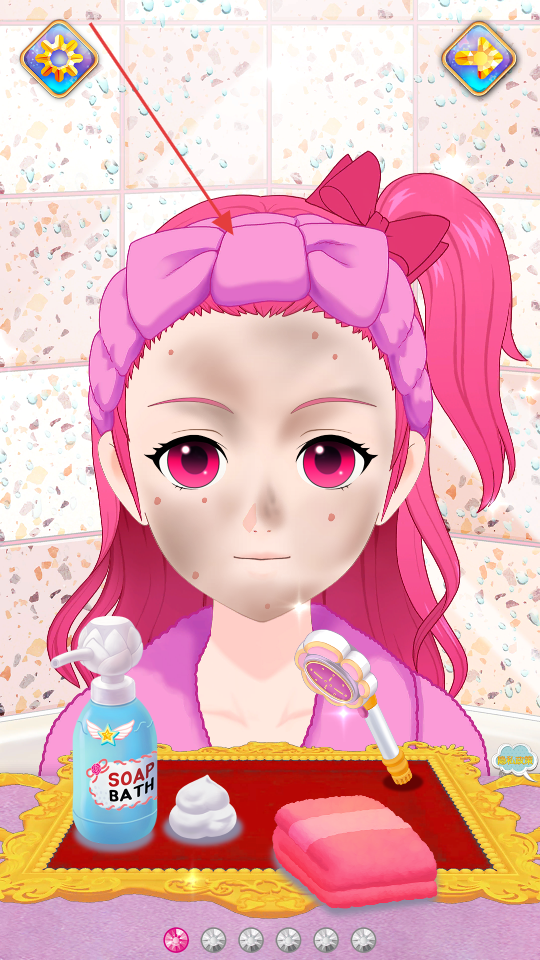 3、選定角色后會進入類似浴室的場景,利用界面中的沐浴乳、毛巾等護理道具,為芭比進行皮膚護理讓角色以更好的狀態進行裝扮。