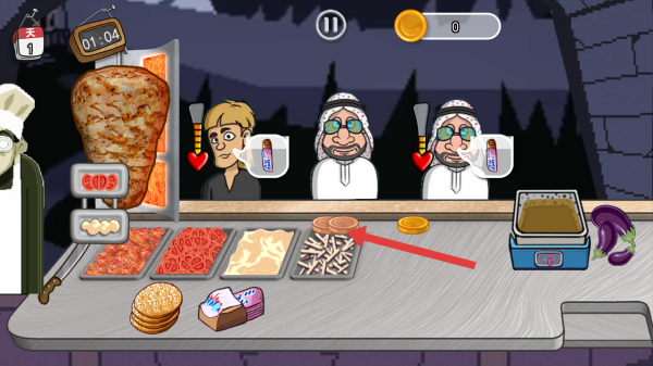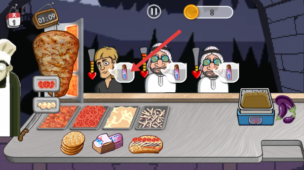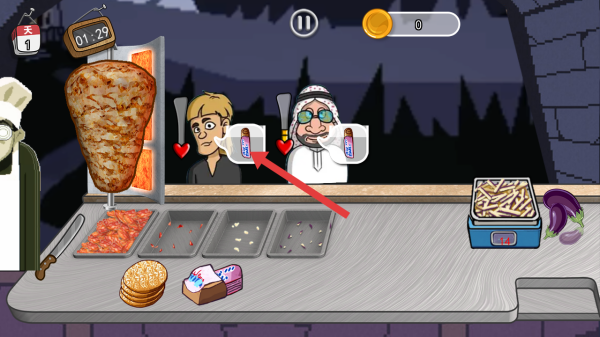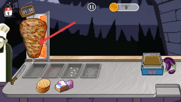 2、有顧客前來,頭頂會顯示所需美食相關標識,根據標識,從烤肉上切下對應食材放到托盤里。