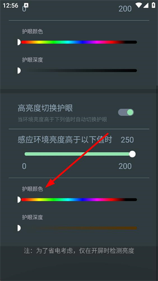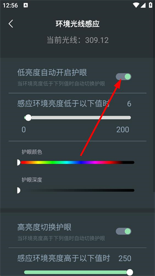 2、環境光感應頁面,可開啟低亮度自動護眼功能,設置感應亮度閾值,還能調整護眼顏色與深度,讓護眼效果更貼合自身使用需求。