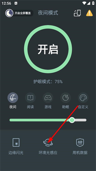 1、進入應用主界面可開啟護眼模式,能選擇夜間閱讀等場景模式,還能調整護眼程度,同時可進入環境光感應設置頁面,適配不同光線環境。