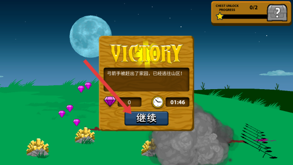 4、成功將弓箭手趕出家園后,會顯示VICTORY的勝利界面,點擊繼續可進入后續游戲內容。