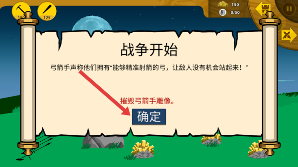1、游戲開始會彈出戰爭開始的卷軸提示,告知要摧毀弓箭手雕像,點擊確定即可開啟戰斗。