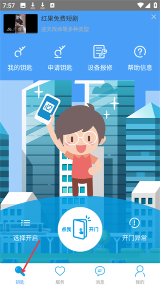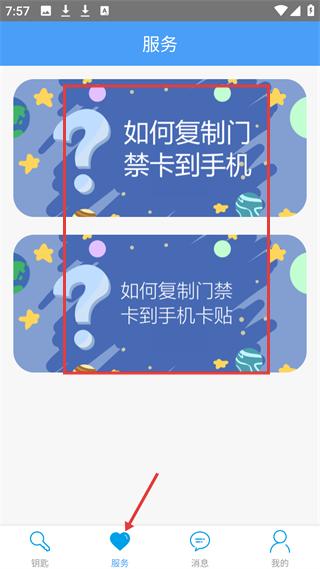 3、服務頁面,有如何復制門禁卡到手機等教程卡片,底部導航欄能在鑰匙、服務等模塊切換。