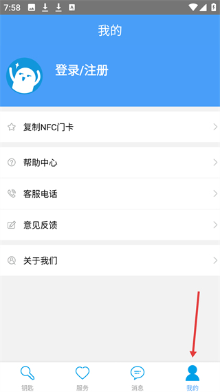 4、個人中心界面,有登錄注冊入口,可復制NFC門卡、進幫助中心等,滿足用戶賬號及服務管理需求。