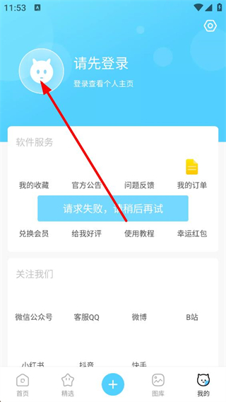 2、進入我的界面后,顯示請先登錄狀態,含軟件服務關注我們等板塊,點擊頭像區域可觸發登錄操作界面。