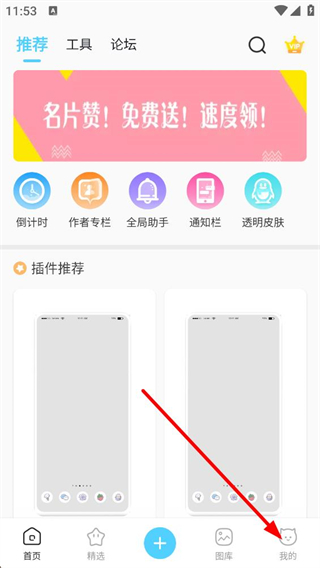 1、進入應用首頁,可見推薦工具論壇標簽,還有倒計時作者專欄等功能入口,含插件推薦板塊,點擊底部我的可進入對應界面。