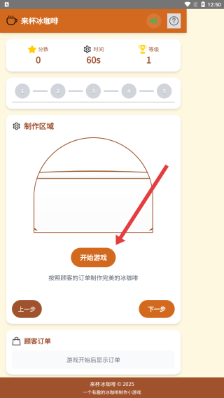 1、進入游戲,看到來杯冰咖啡界面,有分數、時間、等級等顯示,點擊開始游戲,準備制作冰咖啡。