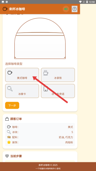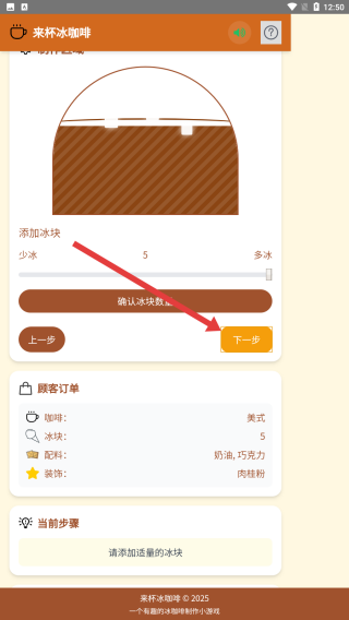 3、接著添加冰塊,按照訂單要求選擇冰塊數量,設置好后點擊下一步,繼續冰咖啡的制作流程。
