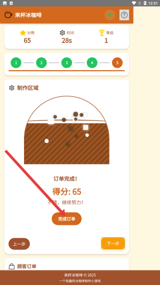 4、完成冰咖啡制作后,會顯示訂單完成界面,能看到得分,點擊完成訂單,結束該訂單的制作。