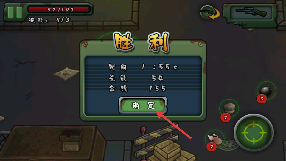 4、成功完成關卡后,會顯示勝利界面,展示時間、殺敵數、金錢等數據,點擊確定按鈕可結算獎勵,繼續挑戰下一關或其他模式。