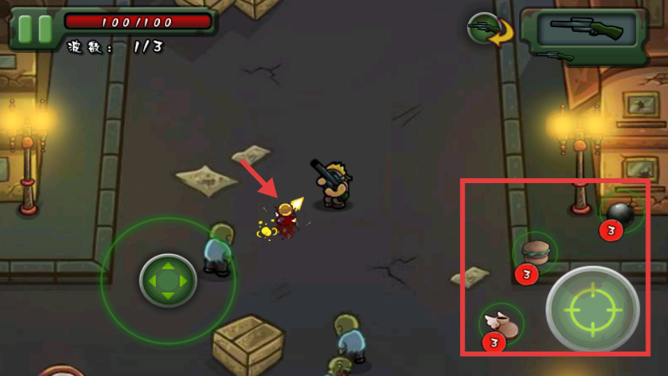 2、進入游戲后左側方向鍵控制移動,右側有攻擊按鈕和道具,如炸彈、漢堡等,利用道具和武器攻擊僵尸,同時注意自身血量躲避僵尸攻擊。