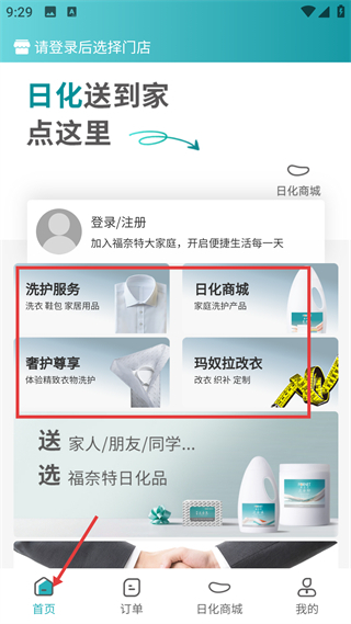 1、首頁需登錄選門店,提供洗護日化奢護改衣服務,支持日化產品配送上門,是服務選擇入口。