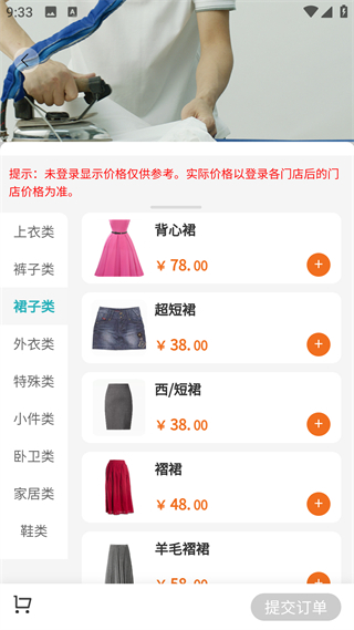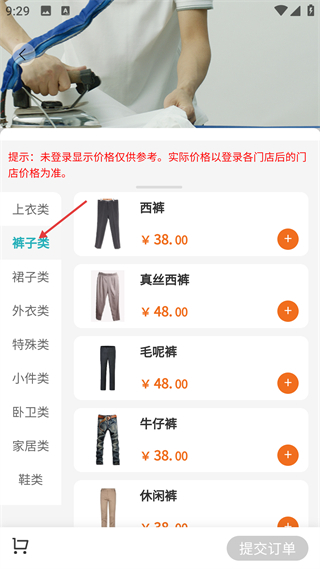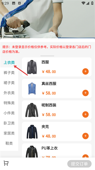 2、上衣類洗護界面含西服真絲西服等品類,標注參考價,登錄后以門店價為準,選品后可提交訂單。