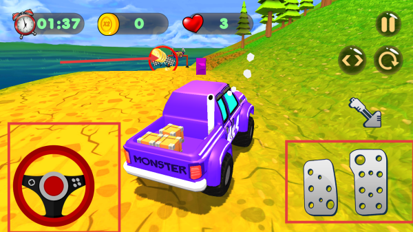 3、在游戲場景中通過屏幕上的方向盤虛擬按鍵控制卡車的行駛方向,利用油門、剎車等按鍵來調節卡車的速度,在崎嶇的賽道上行駛。