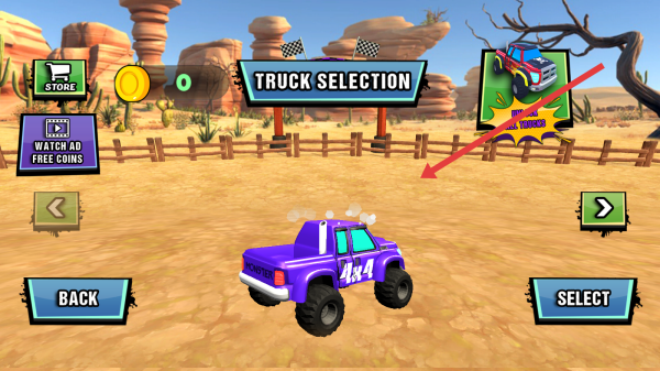 2、進入卡車選擇界面后,可挑選不同樣式的怪物卡車,選定后點擊SELECT按鈕,確定使用該卡車進行游戲。