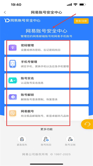 2、賬號安全中心功能頁,可進行密碼、手機號、賬號實名等管理,還有賬號解鎖、網易靚號及緊急掛失等更多功能。