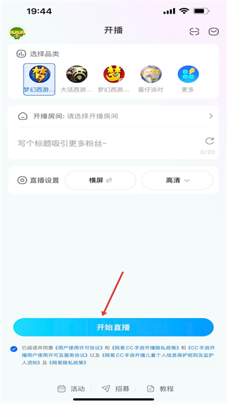 3、開播頁可選擇夢幻西游等品類,設置開播房間、標題及直播參數,點擊開始直播即可開播,需同意相關協議。