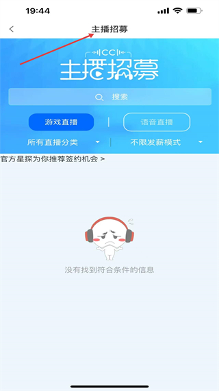 4、主播招募頁有游戲和語音直播分類,可篩選分類和發薪模式,官方星探推薦簽約機會,當前未找到符合條件的招募信息。