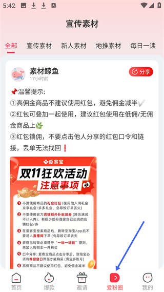 3、愛粉圈頁面素材鯨魚發布雙11狂歡活動溫馨提示,包括高傭金商品用紅包、紅包疊加使用等注意事項助力用戶參與活動。