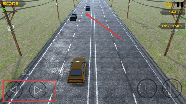 3、在游戲場景中通過屏幕上的方向控制按鍵操控車輛在公路上行駛,在合適的時機和彎道處,做出漂移特技動作,躲避其他車輛。