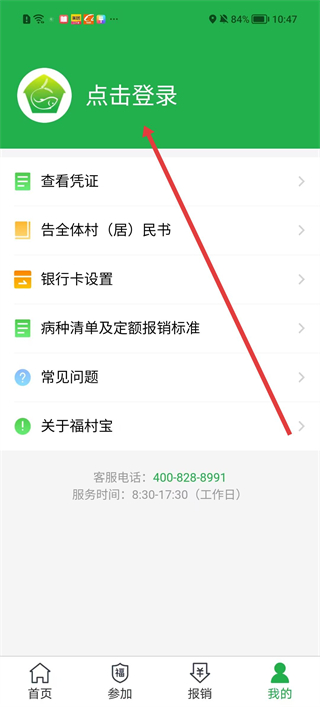 4、點擊我的板塊可進行點擊登錄,登錄后可查看憑證、告全體村民書、銀行卡設置、病種清單及定額報銷標準等,還能查看常見問題和關于福村寶的信息。