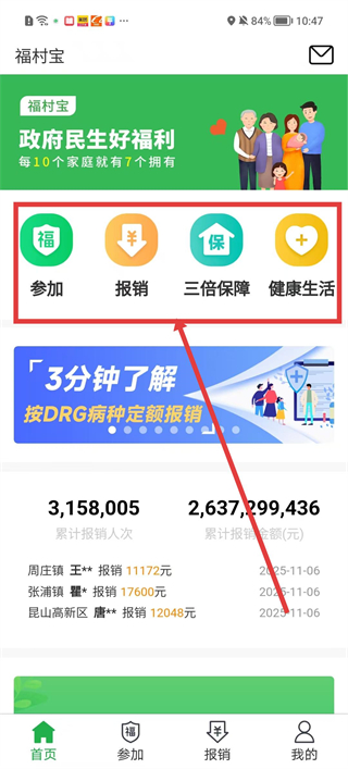 1、進入軟件后可在首頁點擊參加、報銷、三倍保障、健康生活等功能入口,了解累計報銷人次、累計報銷金額等數據,還能查看周莊鎮、張浦鎮等報銷案例。