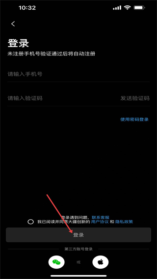 1、進入登錄頁,可通過手機號驗證碼登錄,未注冊手機號驗證后自動注冊,也可選擇密碼或微信蘋果第三方賬號登錄,需勾選相關協議。