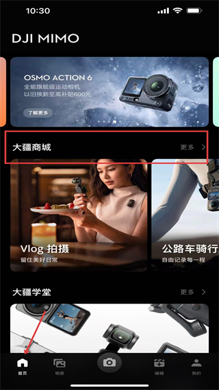 2、進入首頁,可查看大疆產品推廣內容,瀏覽大疆商城與大疆學堂板塊,獲取不同場景的設備應用內容,是產品服務的展示入口。