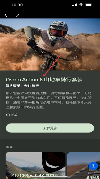 3、進入該產品詳情頁,了解Osmo Action6騎行套裝的配件及用途,其可解放雙手記錄第一視角畫面,標注價格并提供了解更多入口。