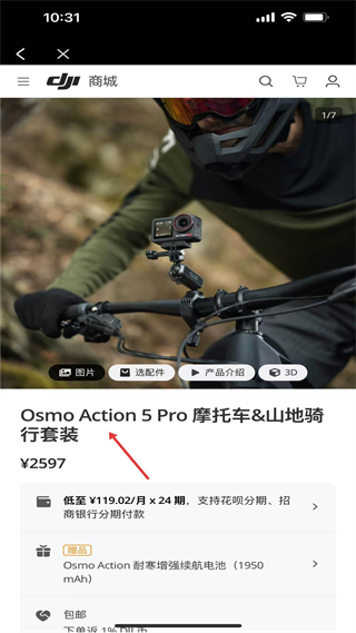 4、進入商城產品頁,查看Osmo Action5Pro套裝的價格分期方案及贈品,可查看圖片選配件等信息,便于了解細節與購買政策。