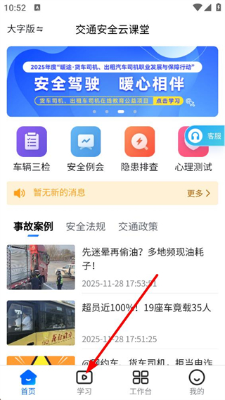 1、進入交通安全云課堂首頁,可查看安全駕駛相關公益項目及車輛三檢等功能入口,點擊底部學習選項,即可進入我的學習界面,準備參與學習內容。