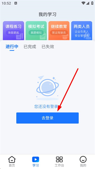 2、我的學習界面,能看到課程練習模擬考試等學習板塊,若未登錄會提示對應信息,點擊去登錄按鈕,即可進入用戶登錄界面進行賬號登錄。