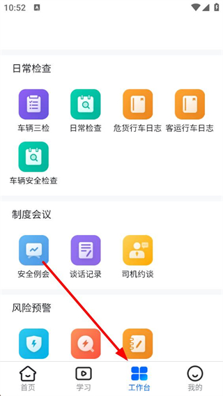 4、登錄后點擊底部工作臺選項,可進入對應界面,這里有日常檢查制度會議等功能板塊,可根據需求選擇車輛三檢等功能,完成相關工作操作。