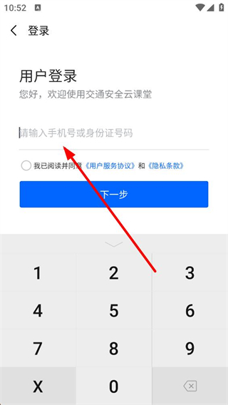 3、進入登錄界面后,輸入框填寫手機號或身份證號碼,勾選同意相關協議后,點擊下一步按鈕,即可繼續完成登錄流程,獲取學習權限。