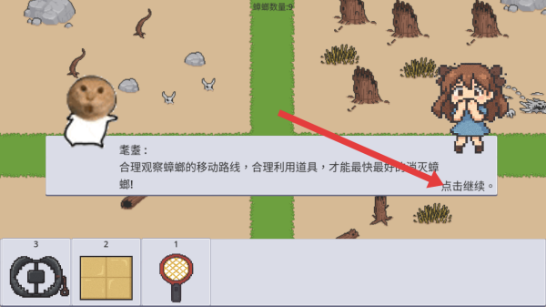 1、進入游戲,先看到像素風劇情對話界面,有消滅蟑螂的提示,讀完對話點擊繼續,開啟滅蟑任務。